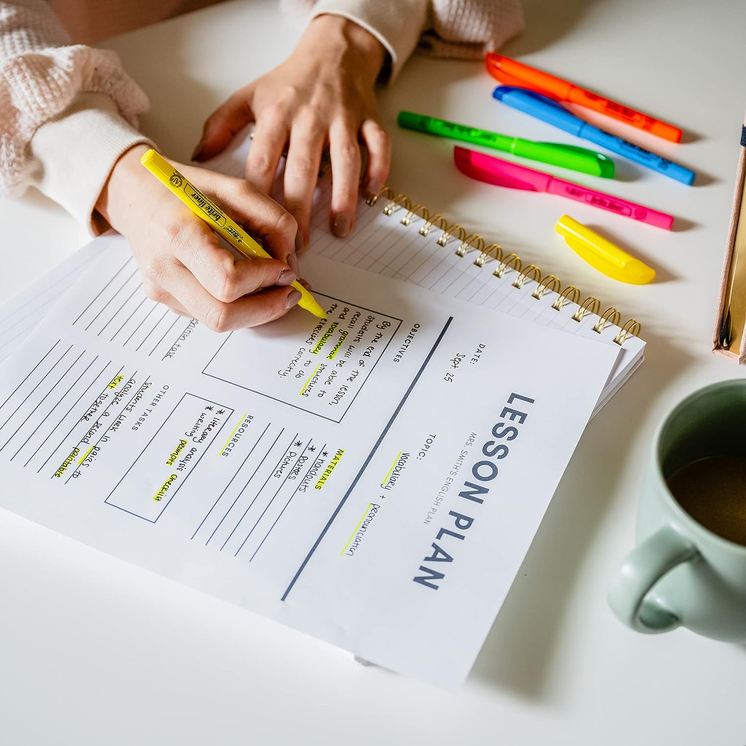 • Highlighter set with translucent ink that emphasizes what’s important on the page without obscuring the highlighted text